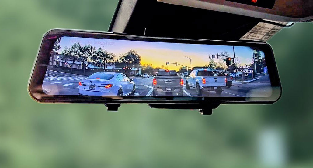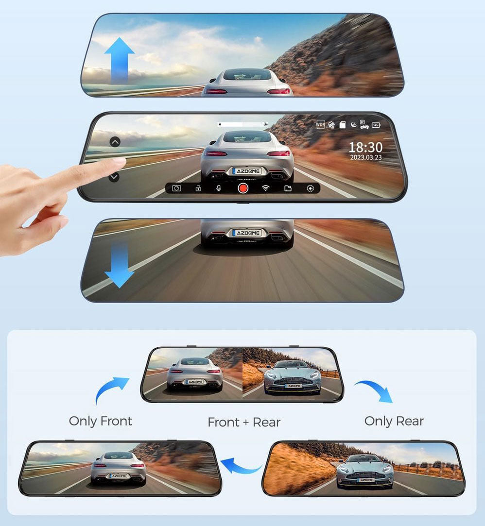 The AZDome PG17 Max Wifi is a uniquely designed 2CH dashcam that can be placed over any rear-view mirror using the included rubber brackets. Its large 12-inch touchscreen LCD screen makes it a high-quality digital rear-view mirror. The rear camera is displayed clearly and in full on the large screen, and you can switch between the front and rear cameras with a single swipe on the screen.