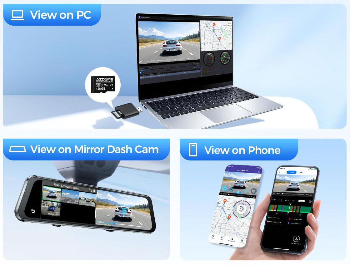 The AZDome PG17 Pro Wifi Full Mirror comes with a 128GB Micro SD card. This allows for approximately 12 hours of filming in Full HD. The camera supports Micro SD cards up to 256GB.