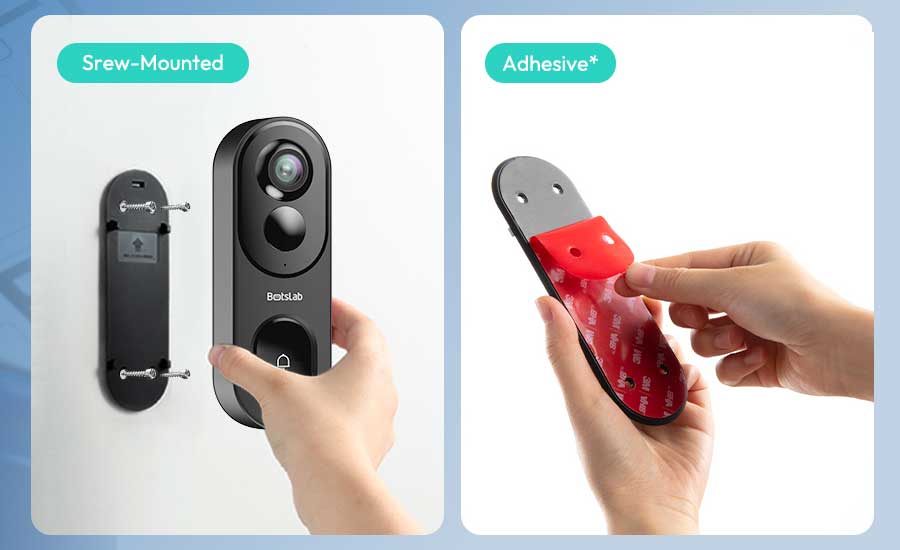 The R810 video doorbell can be mounted with screws or with the included self-adhesive holder. Thanks to the included paper mounting template, marking and mounting is quick and easy.