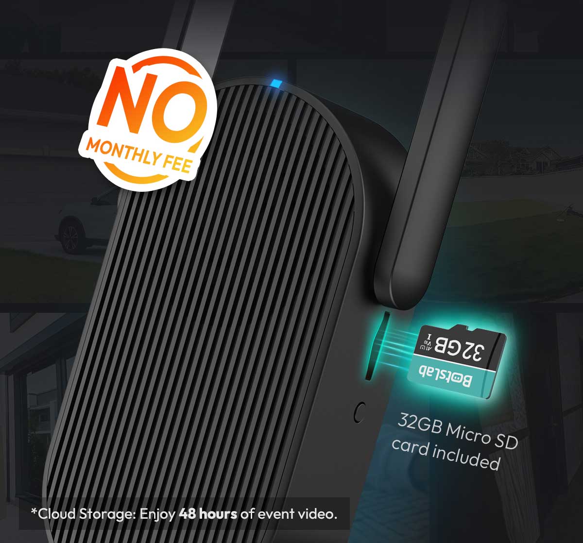 The Botslab R810 supports Micro SD cards up to 256 GB for local storage (32 GB included). You also get free access to Botslab Cloud storage, which stores video images in the cloud for up to 48 hours.