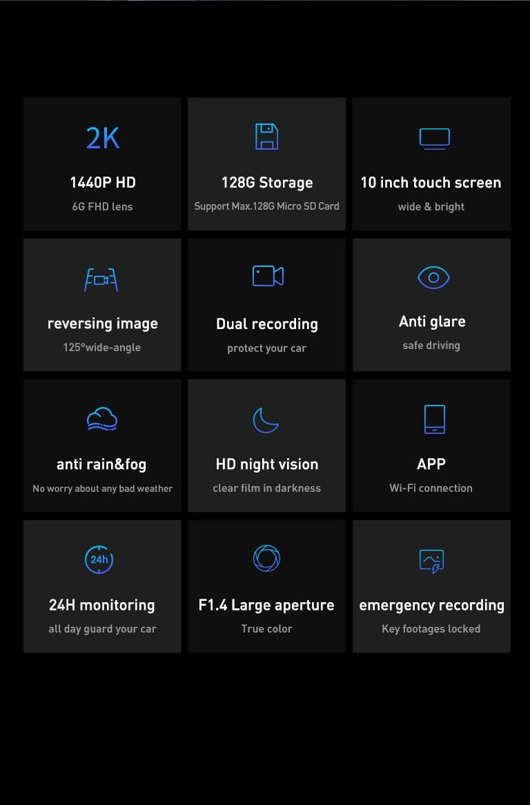 ○ QuadHD + 1080p ○ Wifi ○ 10.0-inch IPS Touchscreen ○ Digital interior mirror