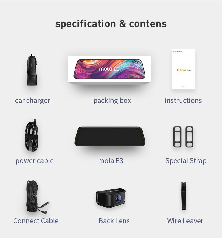 The DDPai Mola E3 2CH Full Mirror Wifi QuadHD dashcam is a uniquely designed 2CH dashcam and can be placed over any interior mirror with the rubber brackets provided. With its large 10-inch touchscreen LCD screen, this makes it a high-quality digital interior mirror. The image from the FullHD rear camera is displayed fully digitally on the large LCD screen and with one ‘swipe’ on the screen you can switch between the front and rear camera.