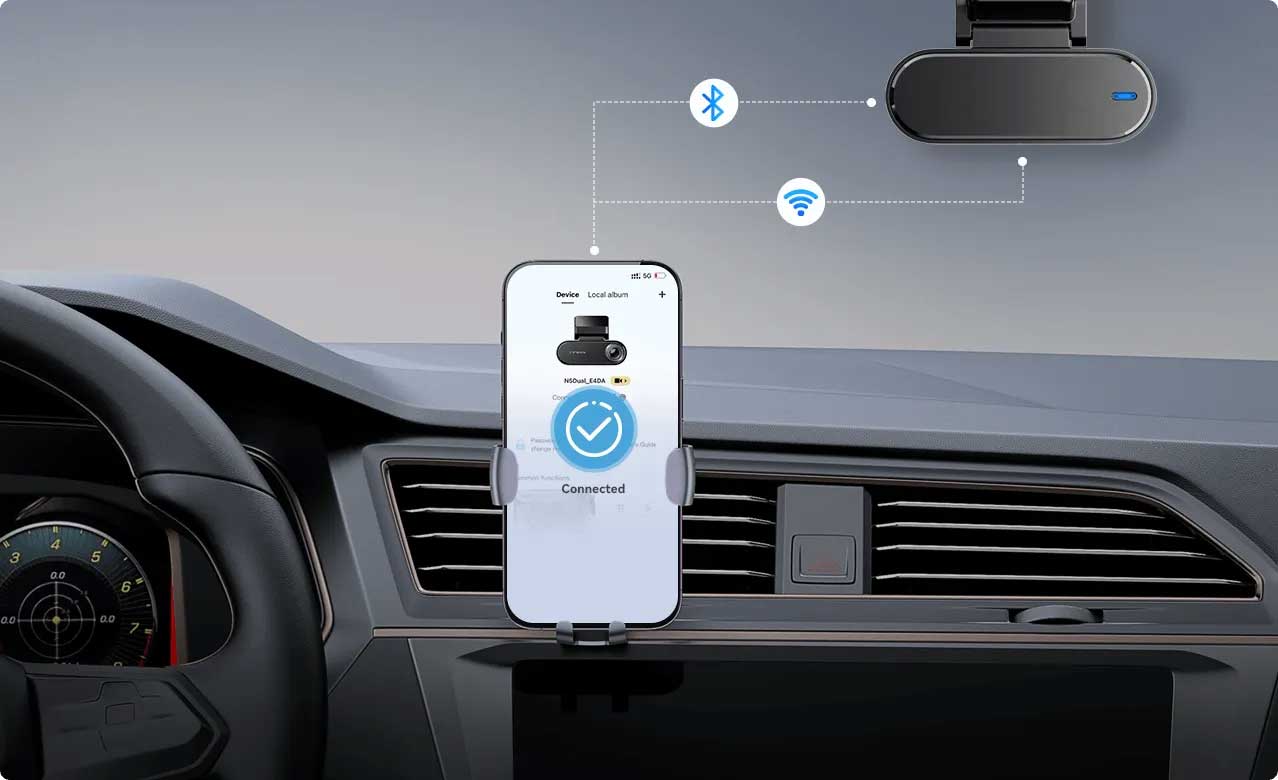 This DDPai N5 Dual is equipped with Wifi and can therefore be used with the DDPai app. The user-friendly app is convenient to operate and can be used to view live or saved footage and to change settings. Any firmware updates can also be conveniently performed via the app.