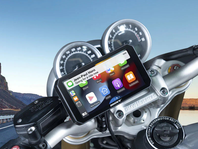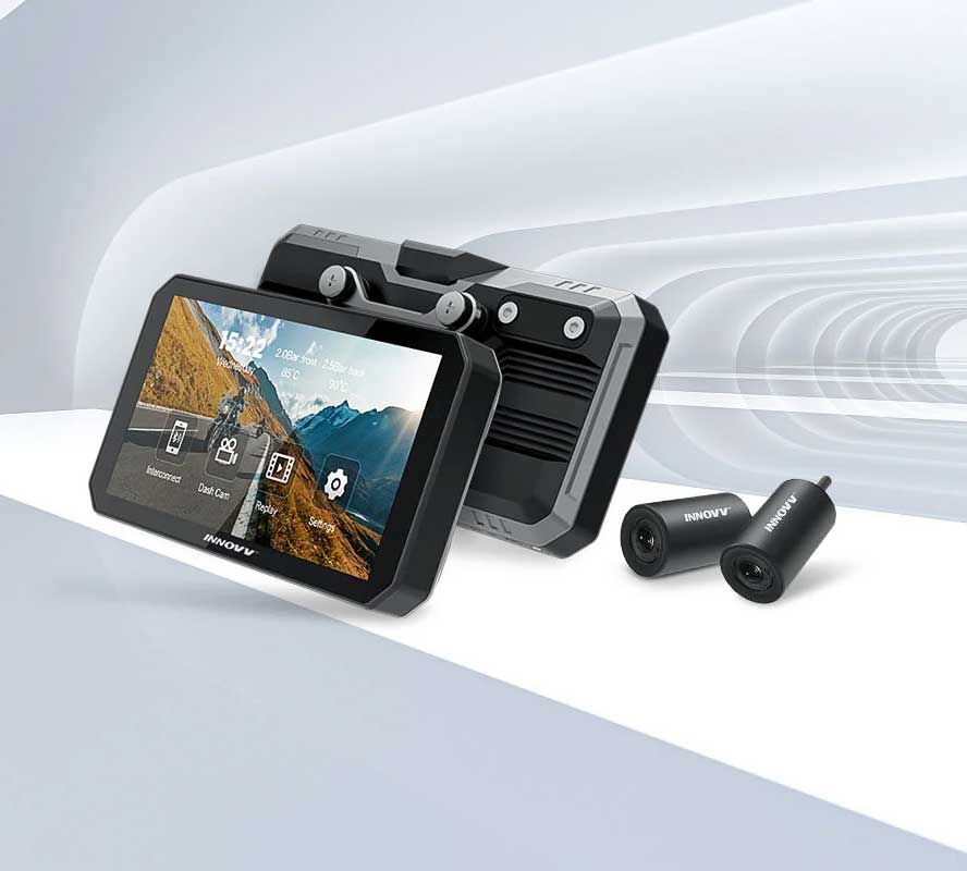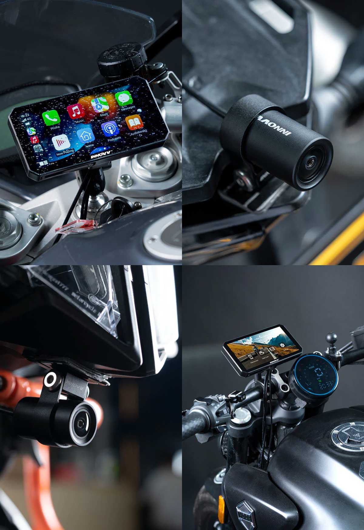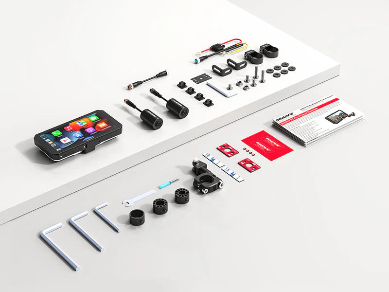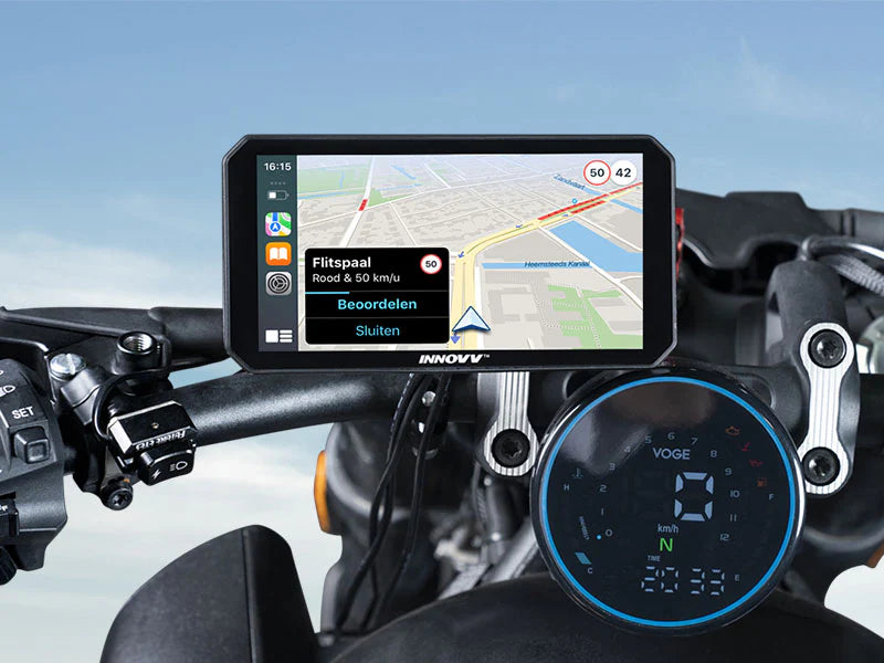 This Innovv N1 Pro is a highly advanced dashcam and Carplay monitor for motorbikes in one. Both FullHD cameras record everything in front and behind you, and you connect your phone via Bluetooth to the monitor on the handlebar to use Google Maps or other Carplay apps, for example. In addition, this Innovv is equipped with all the well-known Innovv specifications such as Wifi and GPS.