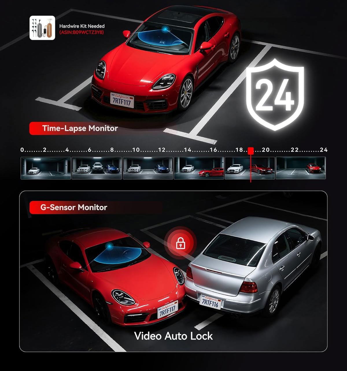 Please note: To use the parking mode, connection to the optional Redtiger hardwire kit is required (see accessories). Parking mode cannot be switched on or off manually.
