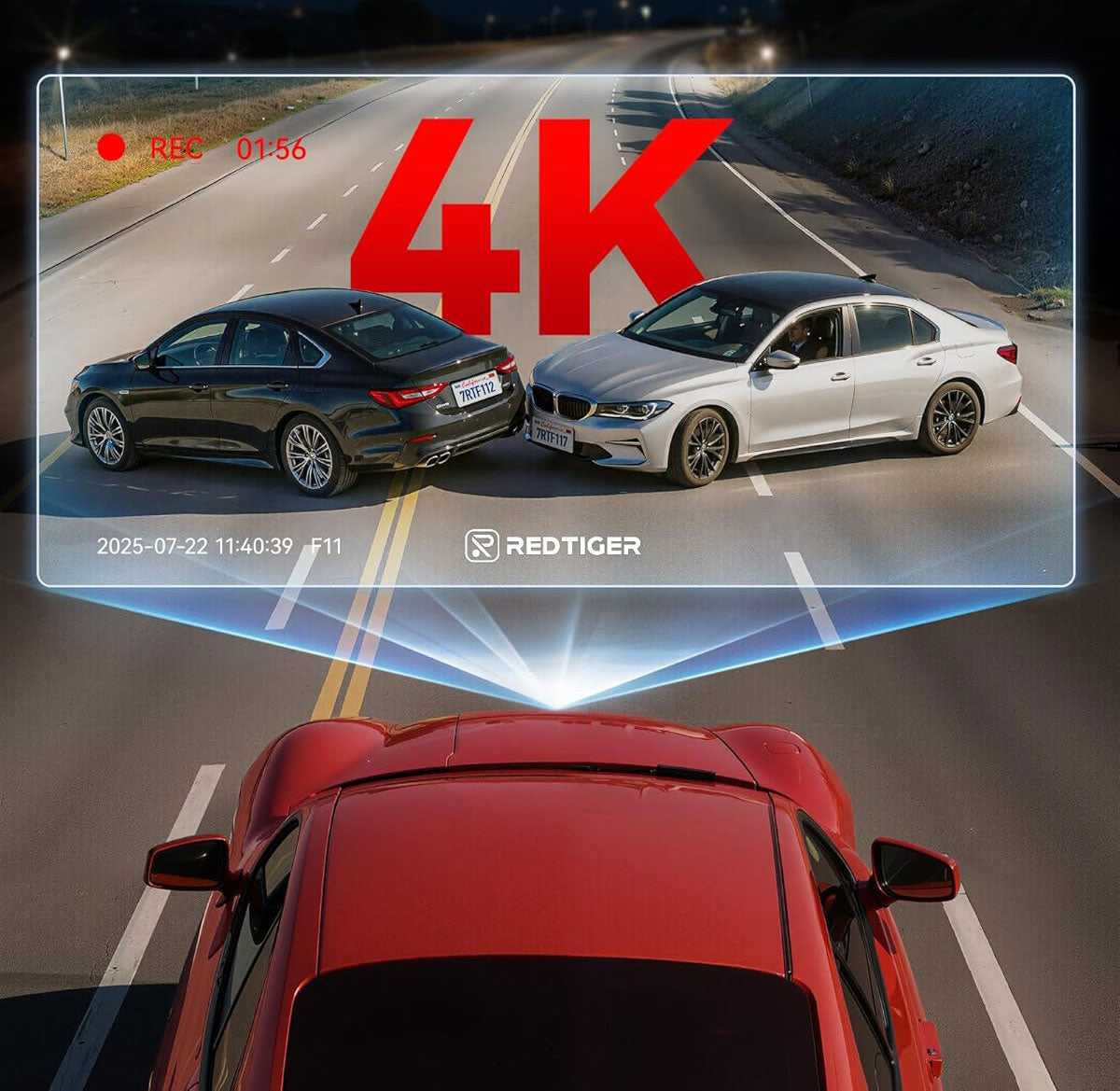 The Redtiger F11 films in sharp Ultra HD 4K resolution (3840×2160). Thanks to the high resolution, traffic situations, number plates and details are clearly captured, making the dashcam suitable as evidence in the event of incidents.