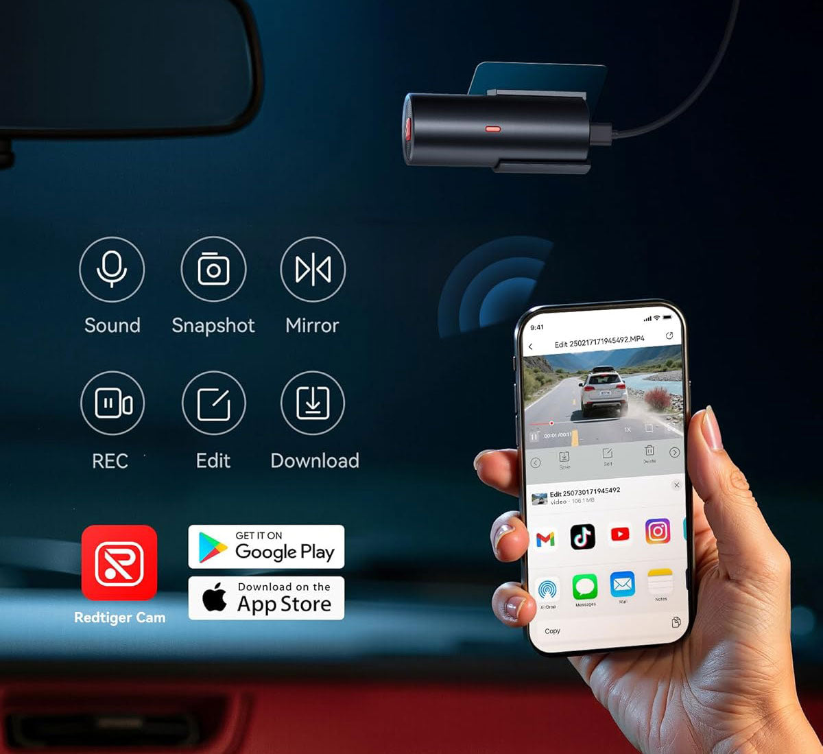 The dashcam is equipped with built-in Wifi, allowing you to easily connect to your smartphone. Via the Redtiger app for iOS and Android, you can watch live, download videos and adjust settings without removing the Micro SD card from the camera. The Wifi has a range of approximately 10 metres.