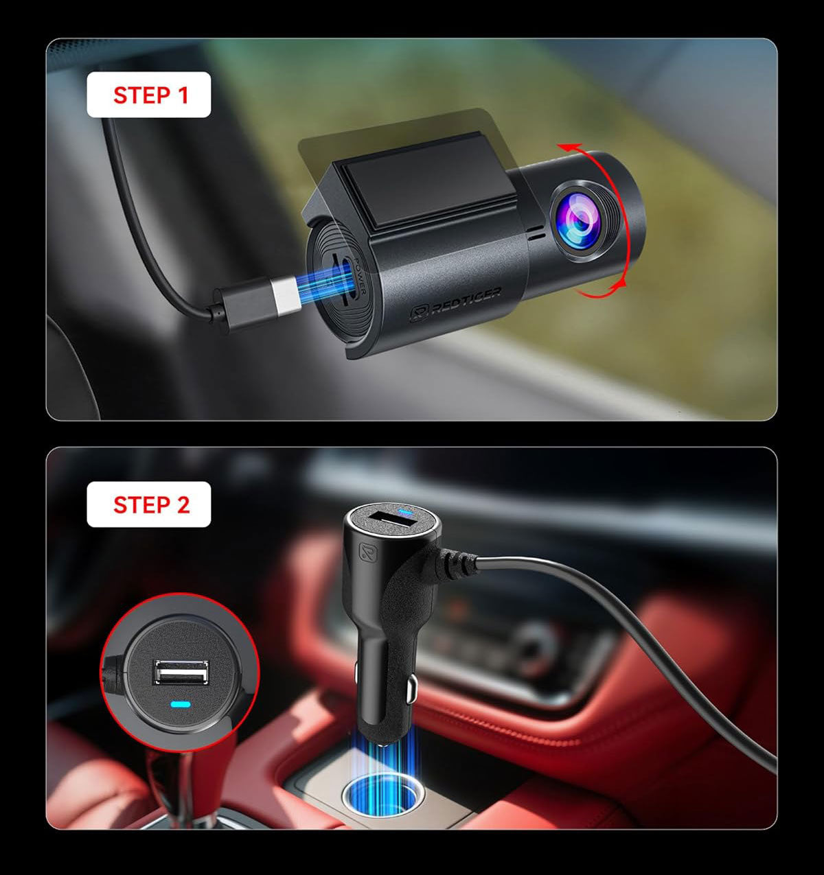 Thanks to its very small size, the Redtiger F11 is virtually invisible behind the rear-view mirror. This prevents distraction while driving and reduces the risk of theft. The camera is securely attached to the windscreen with a self-adhesive mount.