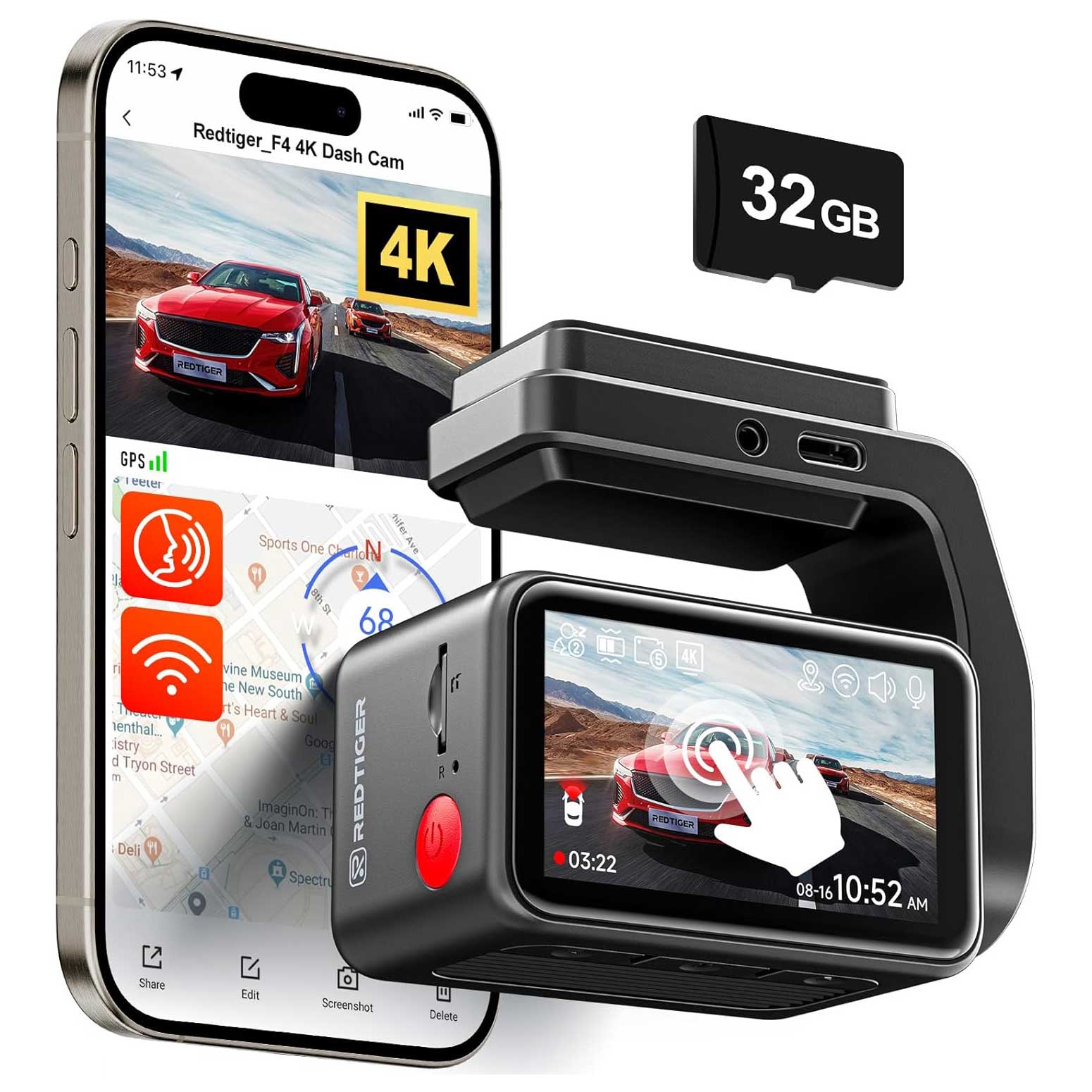 Redtiger F4 4K Touch Wifi GPS 32gb dashcam