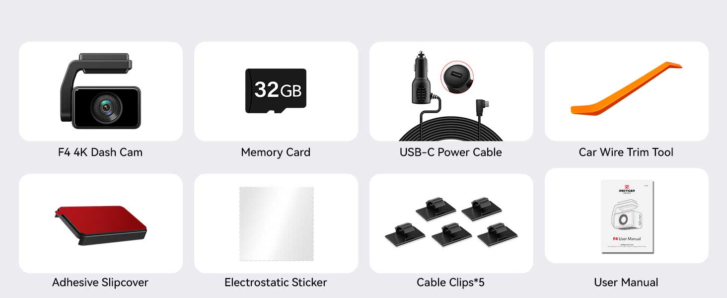 This F4 dashcam comes with a 32GB Micro SD card, good for approximately 8 hours of 4K recording. It supports Micro SD cards up to 256GB, which means approximately 64 hours of recording.