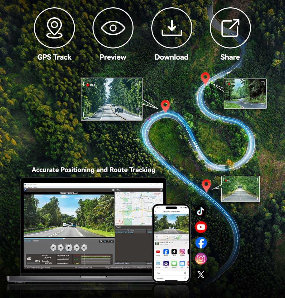 The F4 4K Wifi GPS dashcam has a built-in GPS module. This GPS module displays the speed and also keeps track of the coordinates of the locations filmed. This allows you to use the included software to see exactly where certain recordings were made.