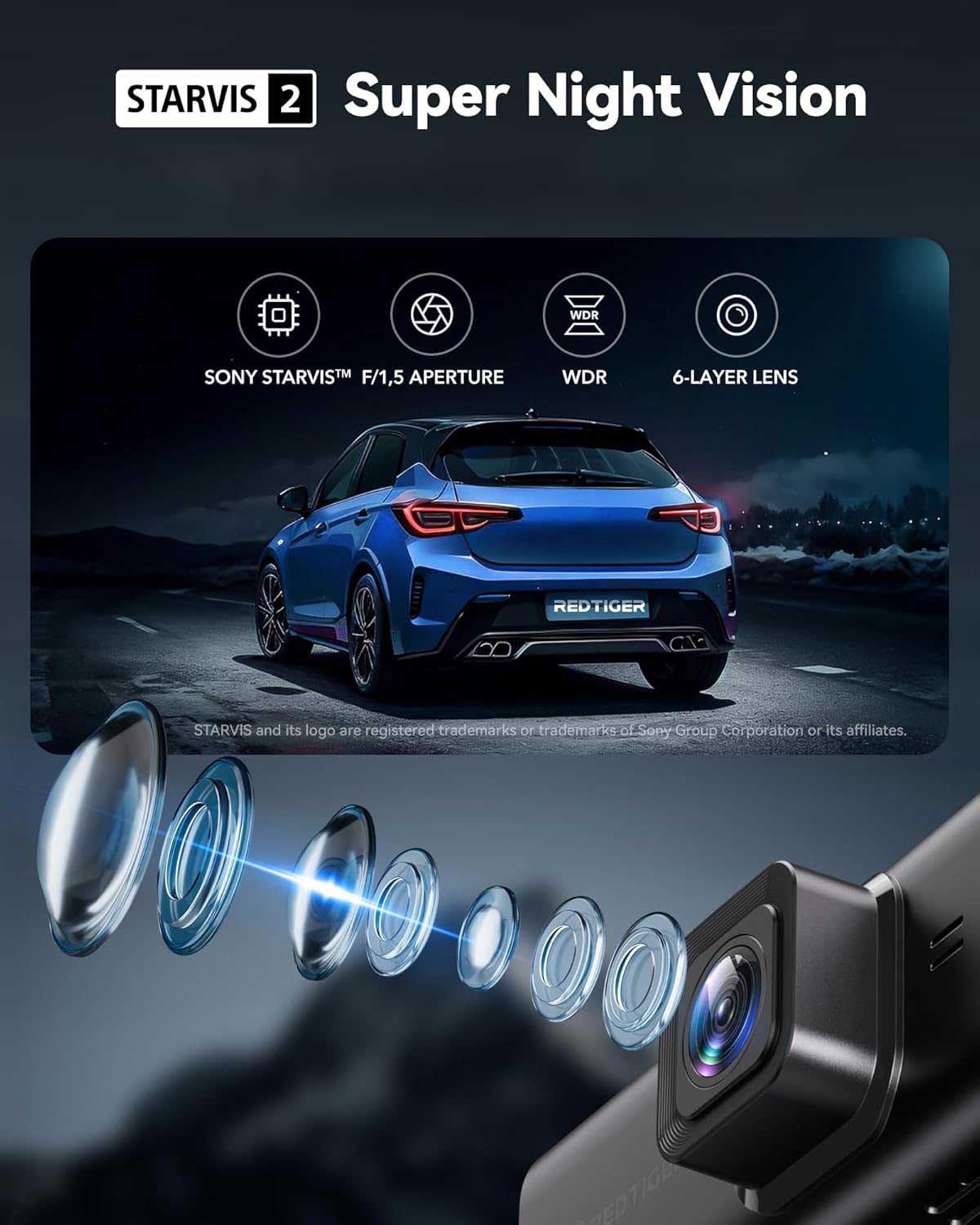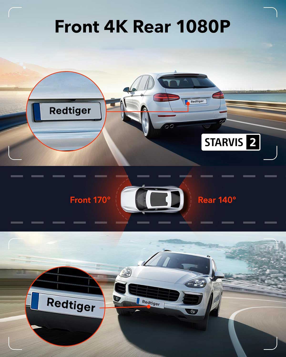 The Redtiger F7NT is a true night vision dashcam thanks to the Sony Starvis 2 image sensor. Super powerful sensors guarantee the sharpest images and are unrivaled, especially in the dark. The videos are recorded in 4K (3840p) resolution at 24fps on the front and FullHD (1080p) at 25fps on the back.