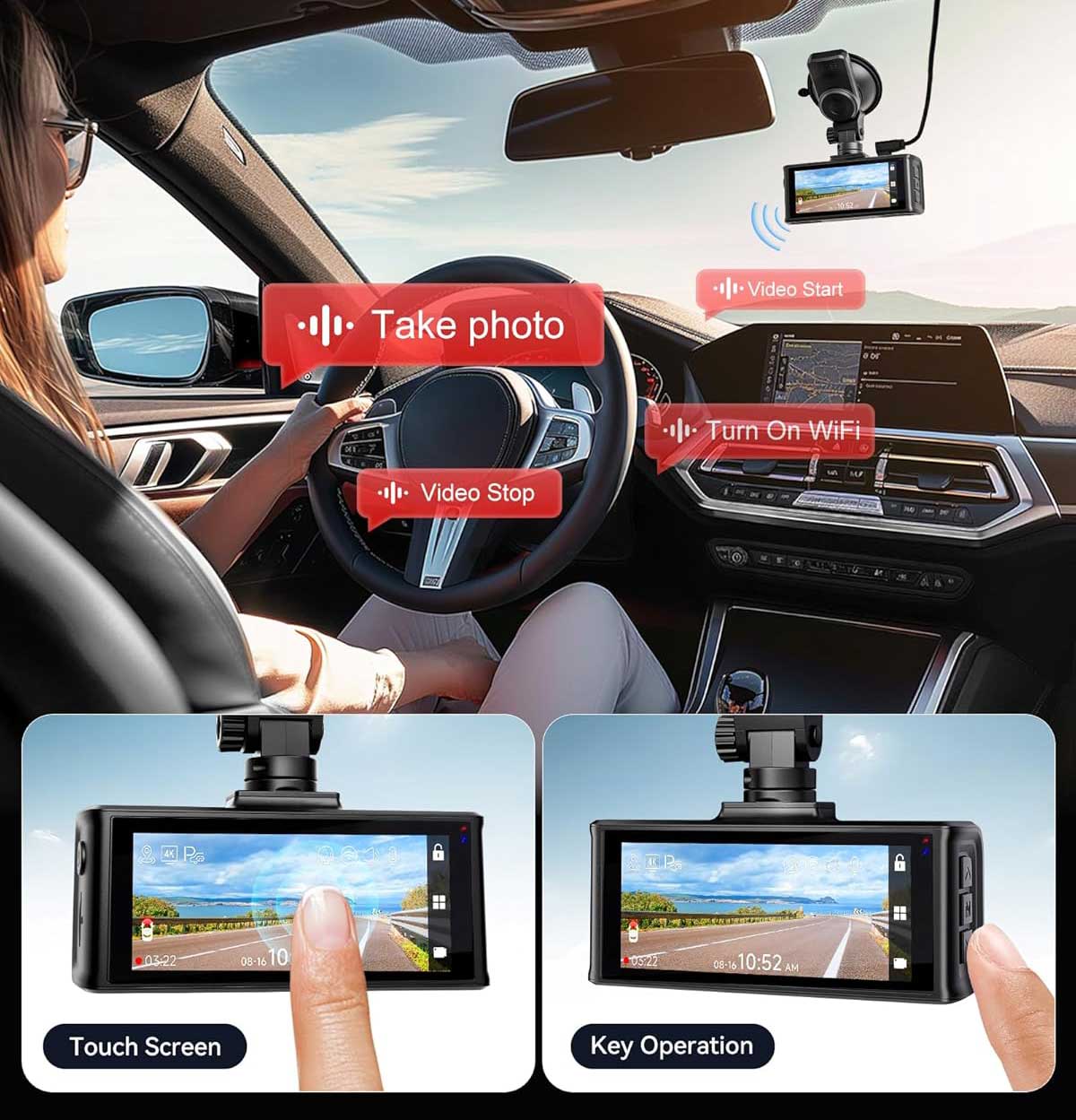 This F7NT 4K Touch Wifi GPS has a wide-angle lens of 170 degrees at the front and 140 degrees at the back. This means that a large area around the car is recorded, ensuring that every situation is properly captured.