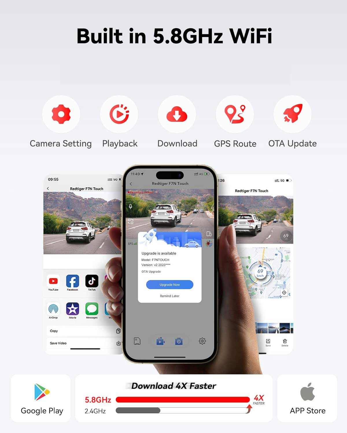 The Redtiger F7NT is equipped with superfast 5.8GHz Wifi, allowing for faster video downloads. The Wifi has a range of about 10 meters and the Redtiger App is available for Android and iPhone phones. Settings can also be easily changed via the App.