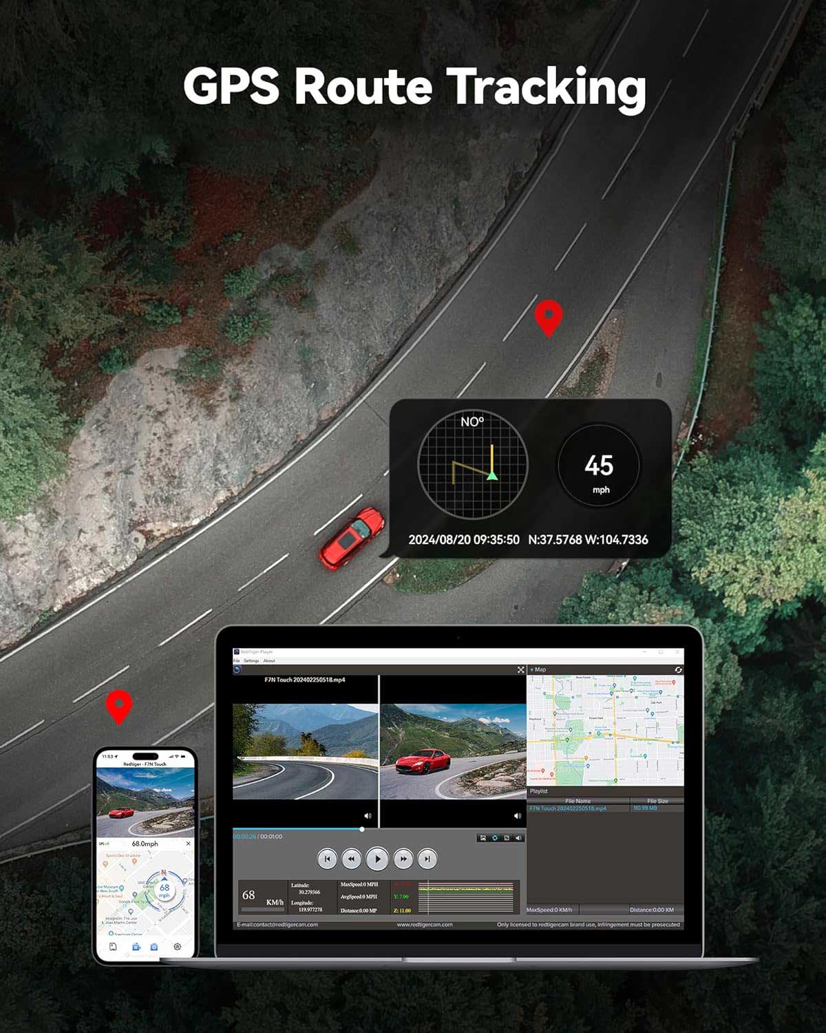 The F7NT 4K Touch Wifi GPS dashcam has a built-in GPS module. This GPS module displays the speed and also keeps track of the coordinates of the locations filmed. This allows you to use the included software to see exactly where certain recordings were made.