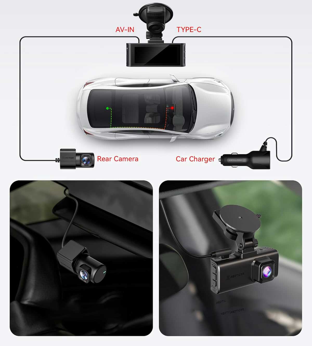 The Redtiger F7NT dashcam comes standard with a FullHD rear camera. This rear camera is mounted on the rear window of the car and records in FullHD 1080p at 25fps. The rear camera is connected to the front dashcam with a long cable (6 meters). The camera does not require an additional power supply. The images from both cameras are stored separately on the SD card. A 10-meter extension cable is available as an option.