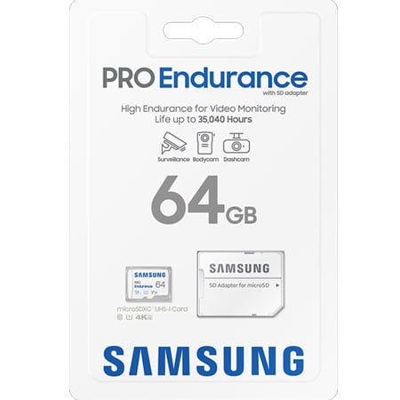 Samsung Pro Endurance 64gb UHS-3 MicroSDXC card, ideal for use in all high-speed dashcams and cameras. The cards are specially designed for use in cameras, even with 4K resolution. This SD card can therefore also be used with the fastest 4K dashcams.