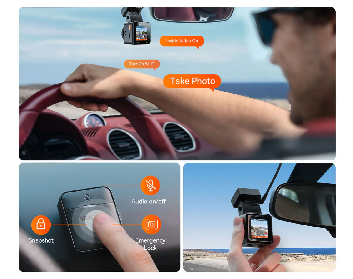 The Vantrue E1 Pro allows you to control the dashcam via voice commands (in English). Commands such as “Make picture”, “Turn off screen”, “Turn on audio” and “Lock the video” allow you to use the dashcam safely while driving and ensure you don't miss a single incident.