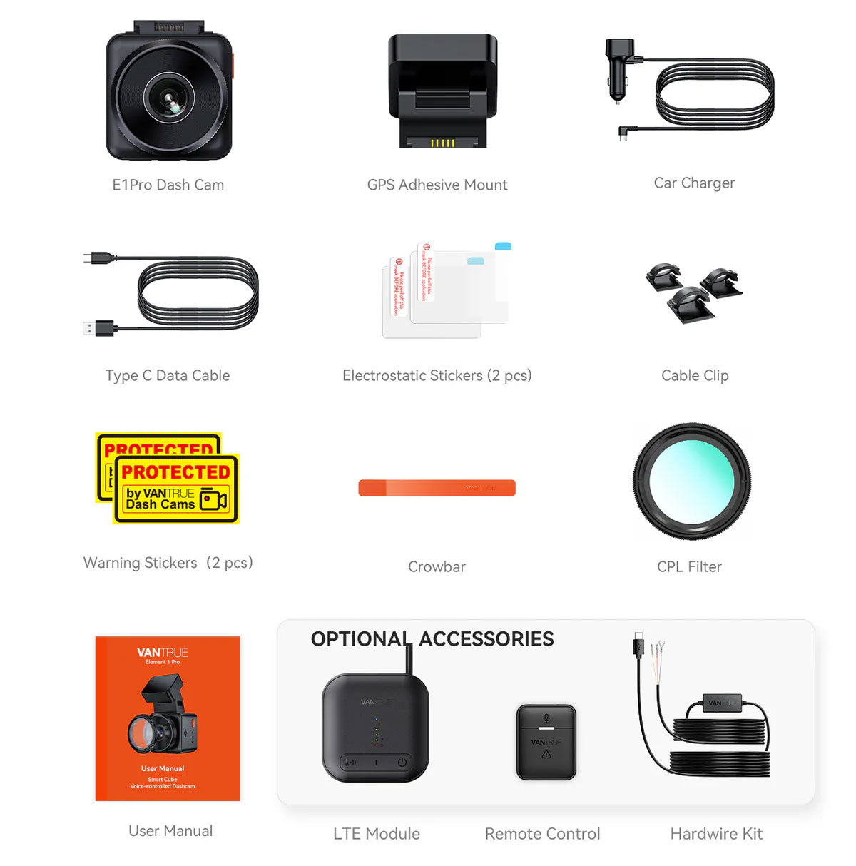 The Vantrue E1 Pro is Vantrue's smallest Cloud dashcam. Connect it to the optional LTE module to connect to your camera anywhere in the world. It films in ultra-sharp 4K resolution thanks to the Sony Starvis IMX678 image sensor, and with PlatePix technology, number plates are always recognisable on screen.