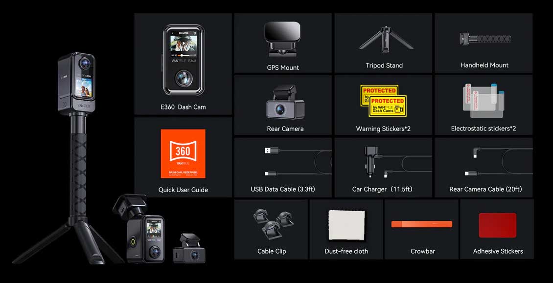 The Vantrue E360 Ace is a new, highly advanced 360-degree dashcam that is suitable for any situation. The dashcam is specially designed to protect your car 24/7, but you can also use the camera as an action cam during your holiday. The included tripod and handheld holder with built-in battery allow you to record up to four hours on a single charge.