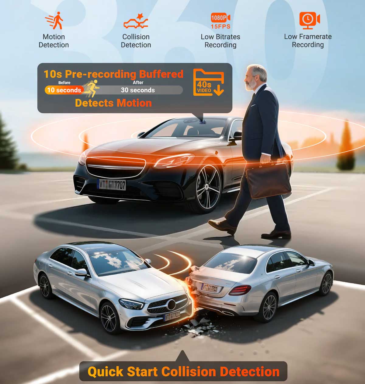 Motion detection: Motion detection (with adjustable sensitivity) where the dashcam is on standby until visual movement is detected. After this, 5 seconds before and 30 seconds after the incident are recorded.
