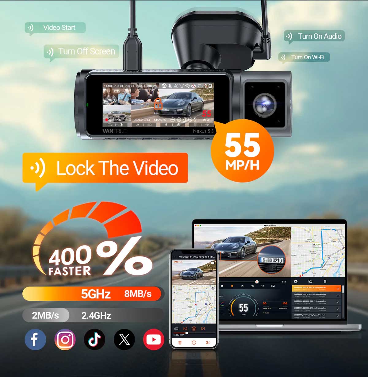 The Vantrue N5S Cloud allows you to control the dashcam via voice commands (in English). Commands such as “Make picture”, “Turn off screen”, “Turn on audio” and “Lock the video” allow you to use the dashcam safely while driving and ensure you don't miss a single incident.