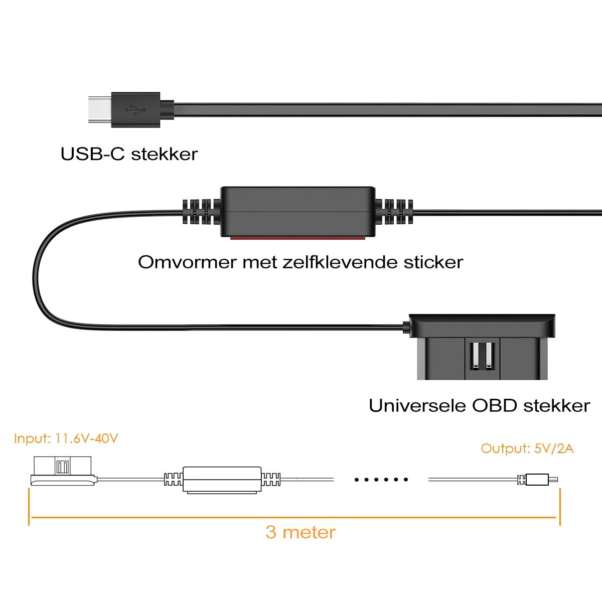 This Vantrue OBD power supply makes it super easy to connect your dashcam to the car's permanent power supply. Plug the OBD plug into your car's OBD port and connect your Vantrue dashcam with the USB-C cable. The dashcam will then automatically switch in and out of parking mode as soon as you turn the car on and off.