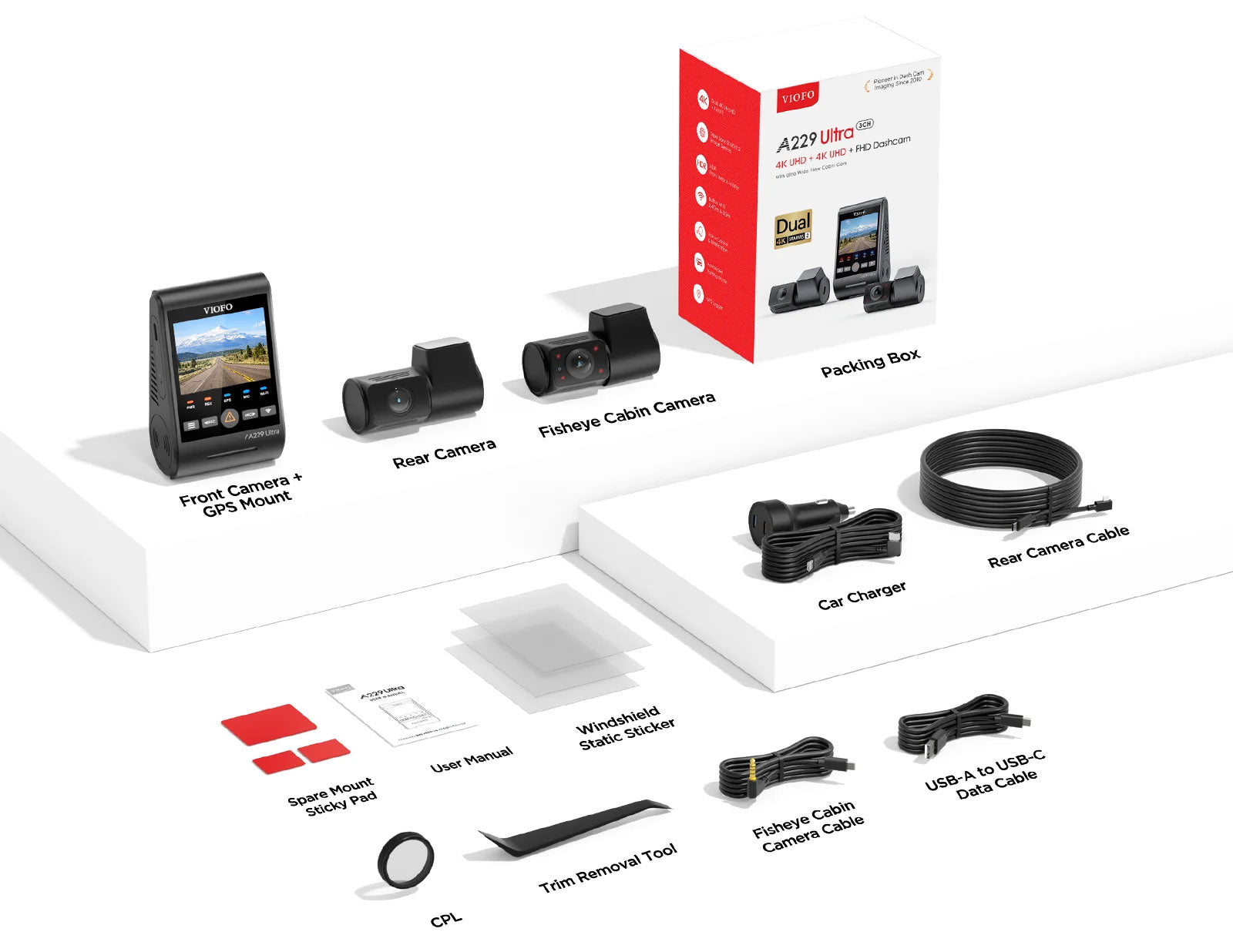 The Viofo A229 Ultra 3CH is the latest 3-channel version of the Viofo A229 series. This Ultra version films with 4K resolution at the front and rear and FullHD for the interior. The Sony Starvis 2 sensors guarantee the best quality videos, both during the day and at night. With the built-in 5.0MP Sony Starvis 2 image sensor, the A229 delivers razor-sharp images, both at the front and rear and inside the car.
