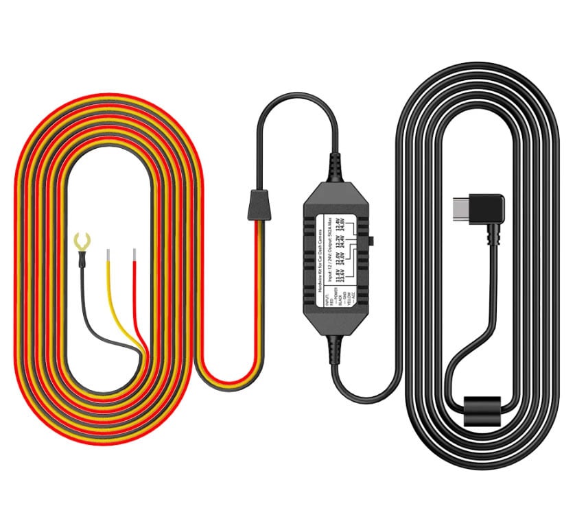The power supply has a built-in module with a switch that ensures the car's battery does not run down from filming with the dashcam. The switch can be set to 11.8V/23.6V, 12.0V/24.0V, 12.2V/24.4V or 12.4V/24.8V. Power is cut off when the battery voltage falls below the set threshold.