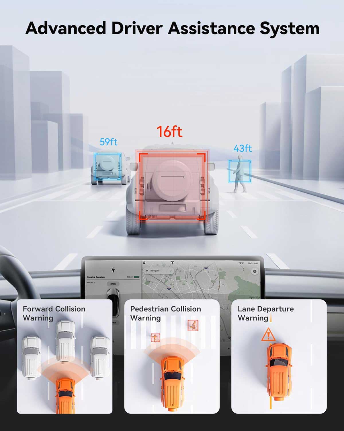 This Wolfbox G840H can support the driver by providing warnings in dangerous situations. A warning will be given in the following situations, if desired: