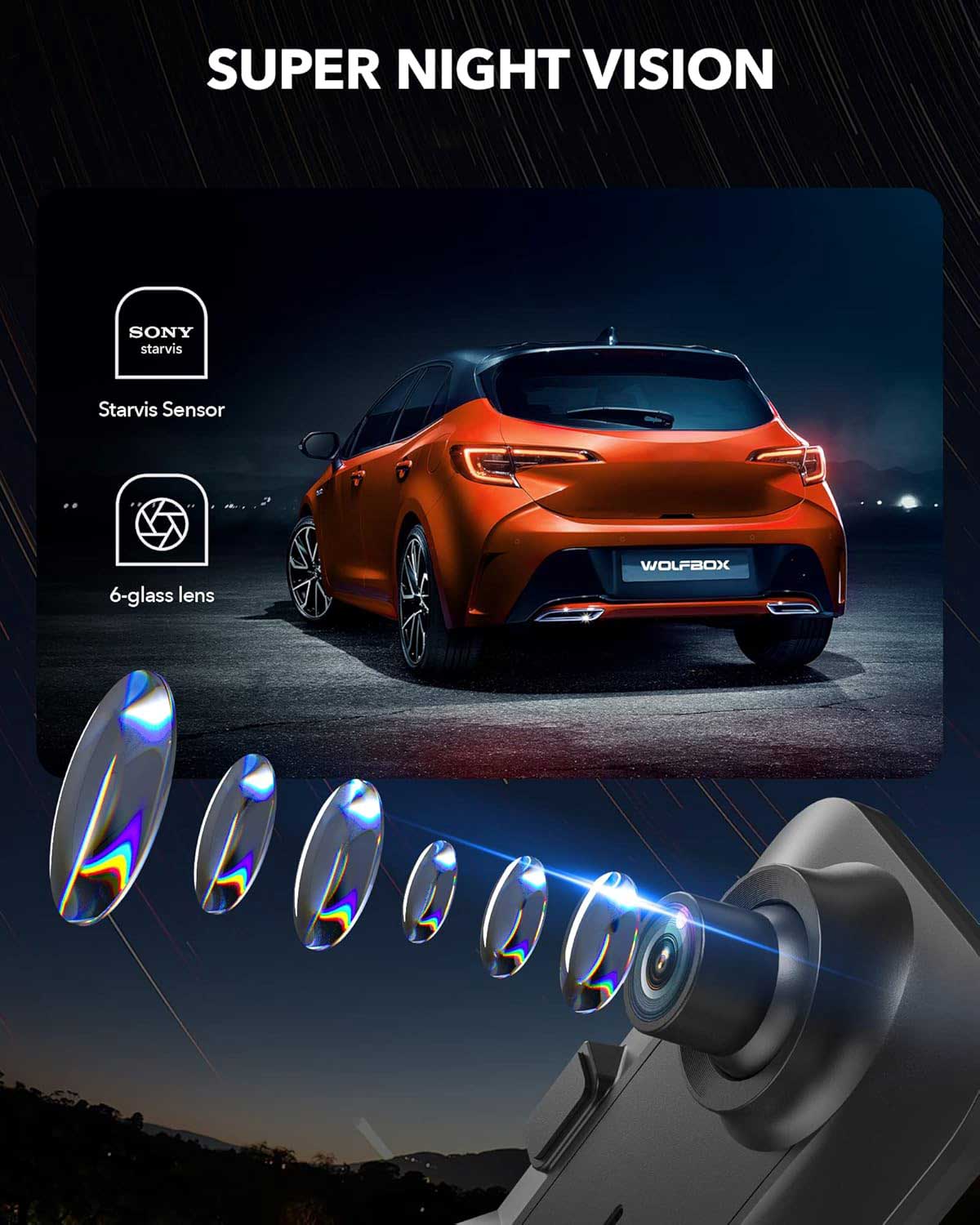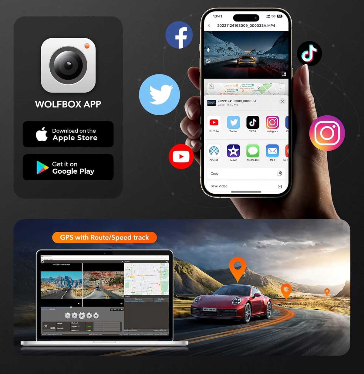 The Wolfbox G840H is equipped with super-fast 5.8 GHz Wifi. You can use your phone to connect to the camera within range of the camera (+/- 5 meters) via Wifi. You can easily view, download or share videos and change camera settings via the Wolfbox App.