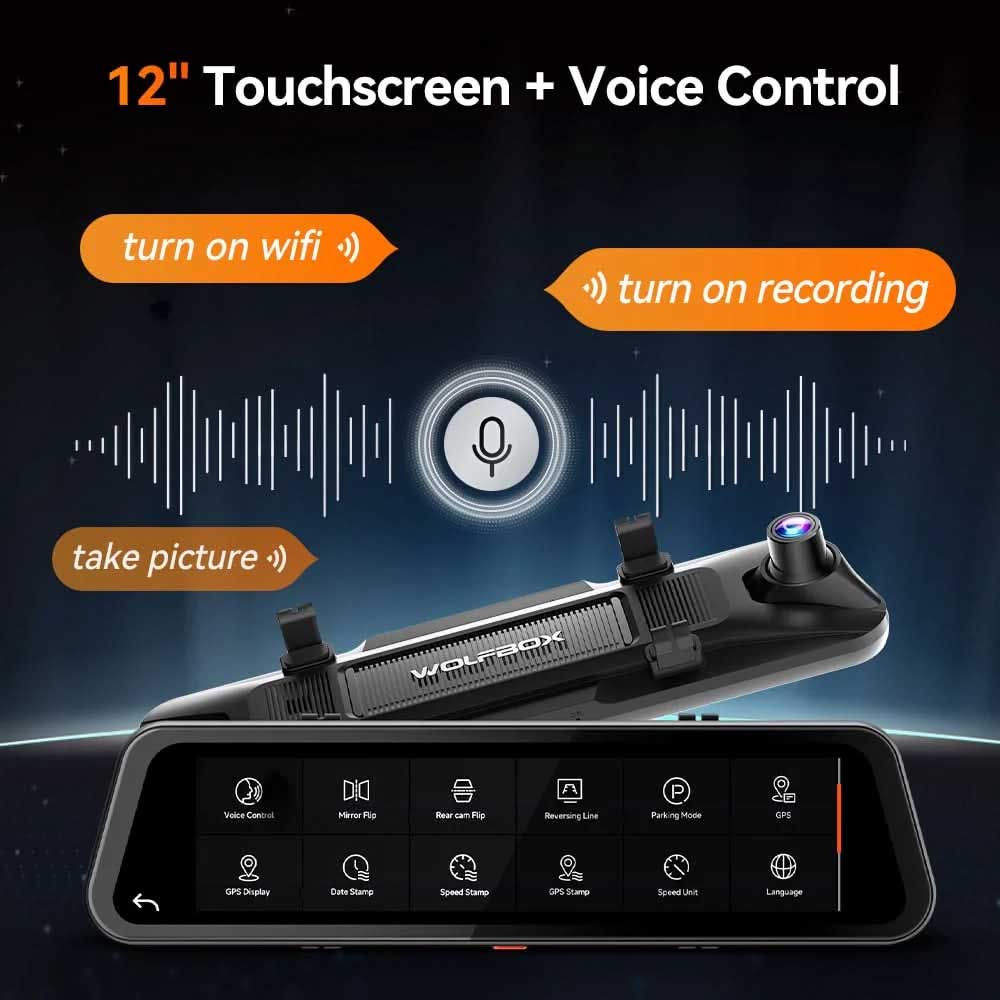 The Wolfbox G900 Tripro 4K is a uniquely designed mirror dashcam and digital rear-view mirror in one. The large 12-inch mirror also functions as a fully digital LCD screen on which the image from the rear camera can be displayed. The Wolfbox G900 is therefore ideal for vehicles with poor rear visibility. It comes with brackets to place it over an existing interior mirror. A holder for the windscreen or dashboard is also available as an option for vehicles without an interior mirror.