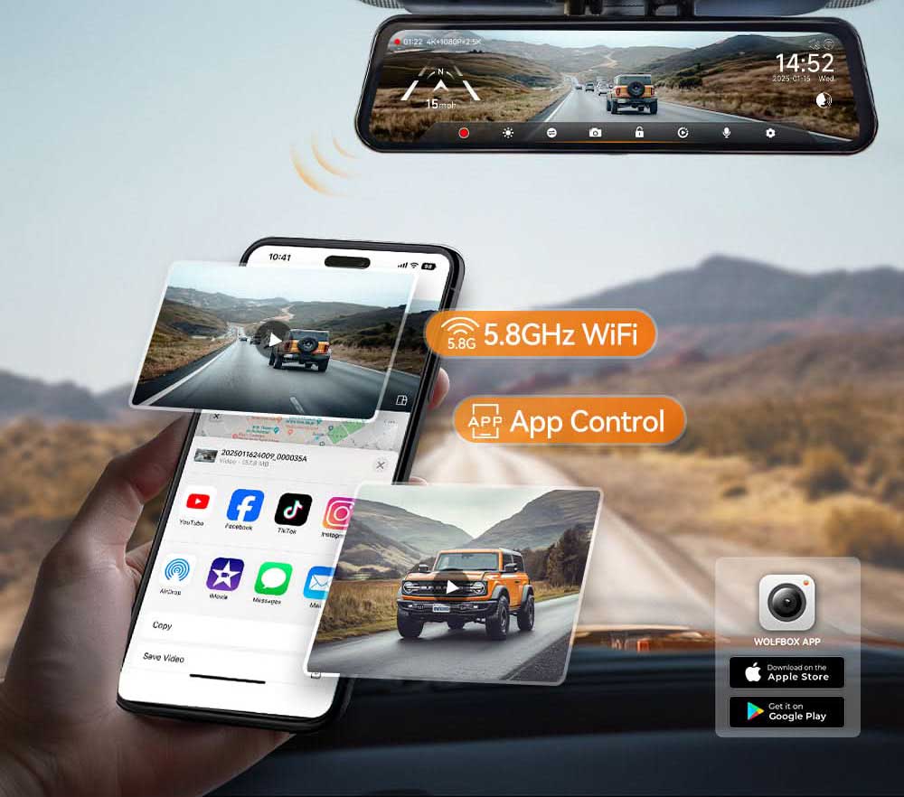 The Wolfbox G900 Tripro is equipped with super-fast 5.8GHz Wifi. Via the Wifi, you can connect your phone to the camera within range of the camera (+/- 5 metres). Using the Wolfbox App, you can easily view, download or share videos and change camera settings.