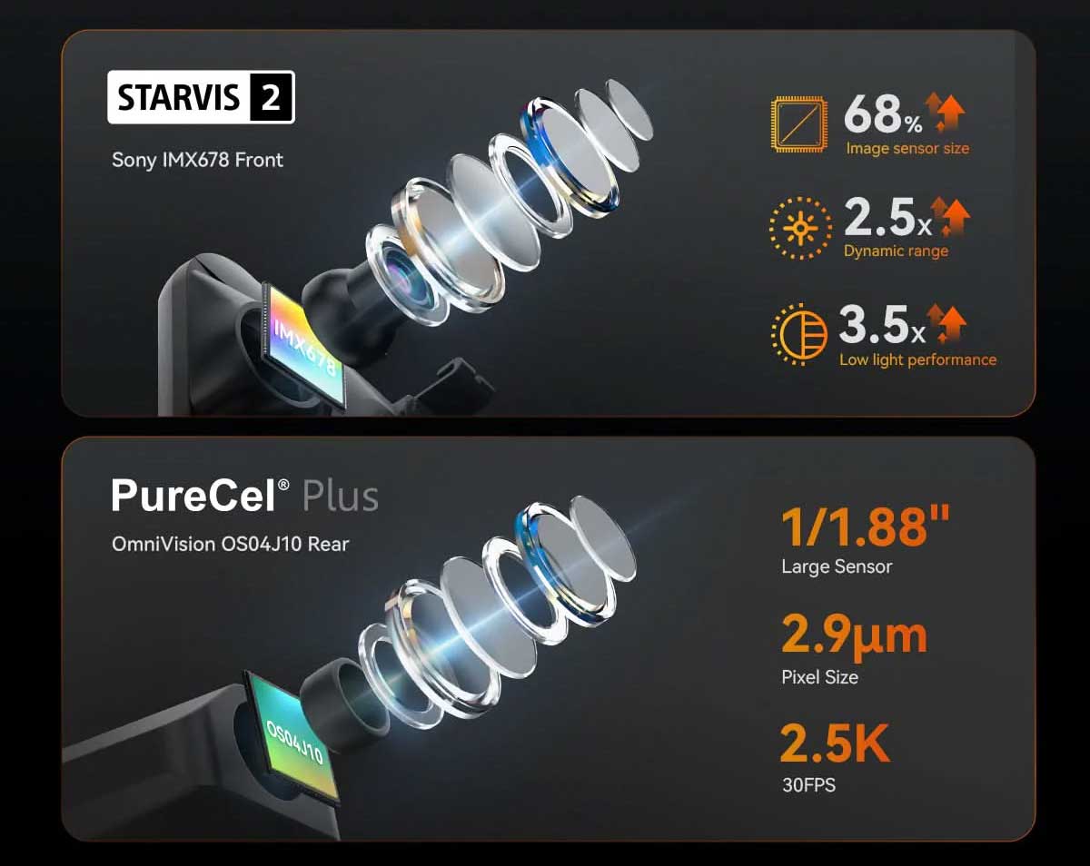 The Wolfbox G900 Tripro is equipped with the latest Sony Starvis 2 sensor, which guarantees the best image quality, especially in the dark. The front camera records in razor-sharp 4K resolution at 30fps and the rear camera at 2.5K at 25fps. The third interior camera films in Full HD.