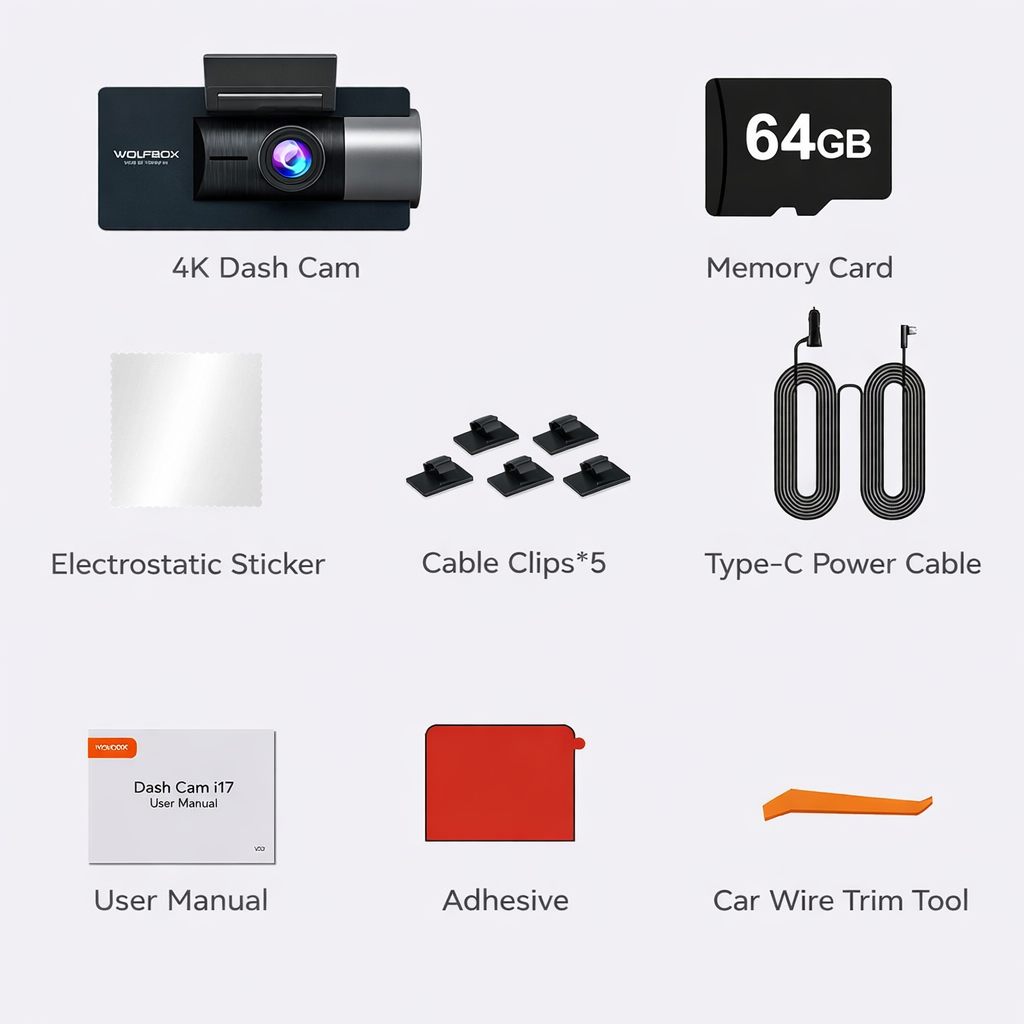 The Wolfbox i17 is the perfect dashcam to record everything in and around your car in the best quality. This 3CH (3-channel) dashcam films the front and back and the interior of your car. It is also equipped with Wifi and GPS and a handy parking mode to secure your car. Start recording immediately with the included 64GB Micro SD card.