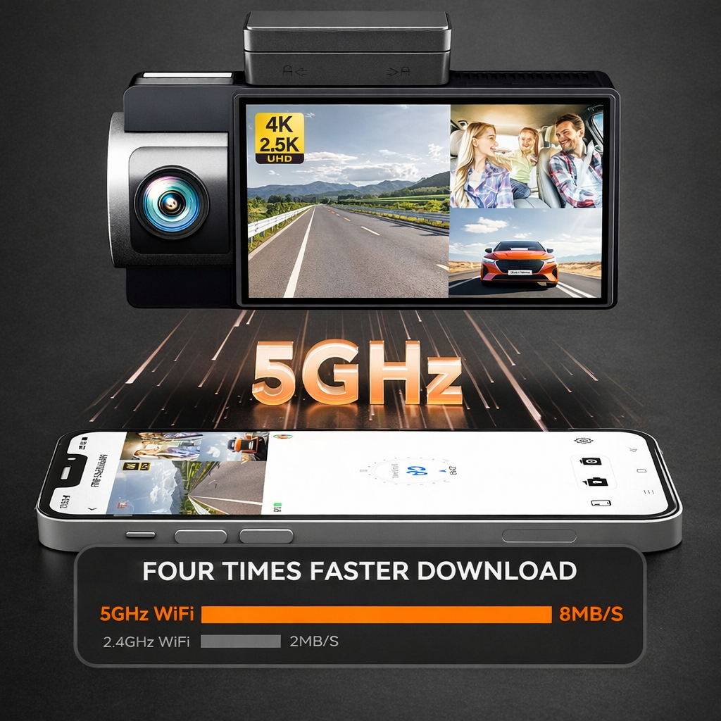 The Wolfbox i17 3CH is equipped with superfast 5.8GHz Wifi, allowing for faster video downloads. The Wifi has a range of about 10 meters and the Wolfbox App is available for Android and iPhone phones. Settings can also be easily changed via the App.