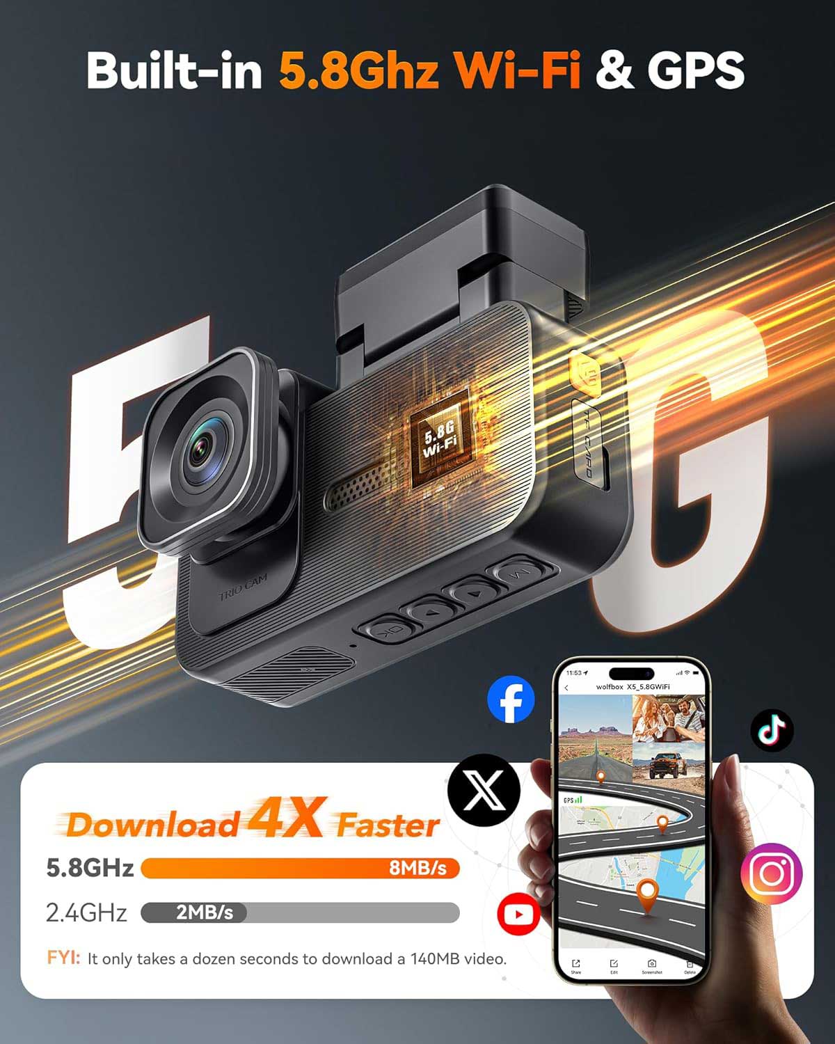 The Wolfbox X5 3CH is equipped with superfast 5.8GHz Wifi, allowing for faster video downloads. The Wifi has a range of about 10 meters and the Wolfbox App is available for Android and iPhone phones. Settings can also be easily changed via the App.